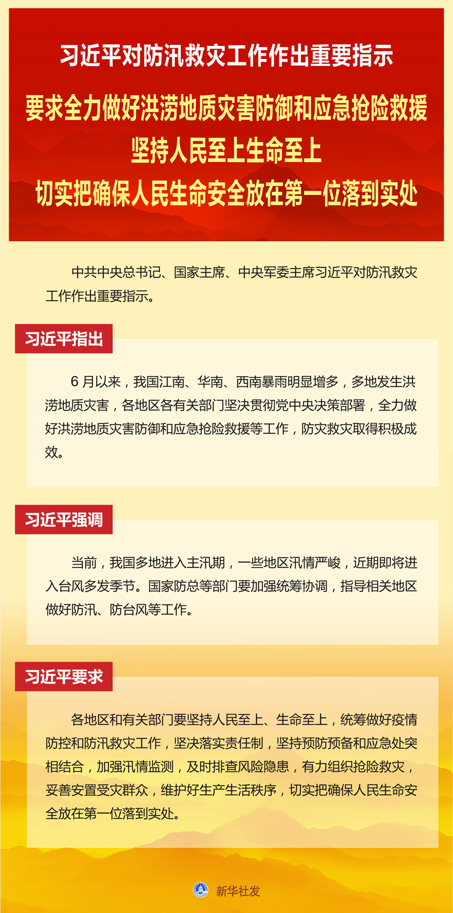 习近平指出,6月以来,我国江南、华南、西南暴雨明显增多,多地发生洪涝地质灾害,各地区各有关部门坚决贯彻党中央决策部署,全力做好洪涝地质灾害防御和应急抢险救援等工作,防灾救灾取得积极成效。