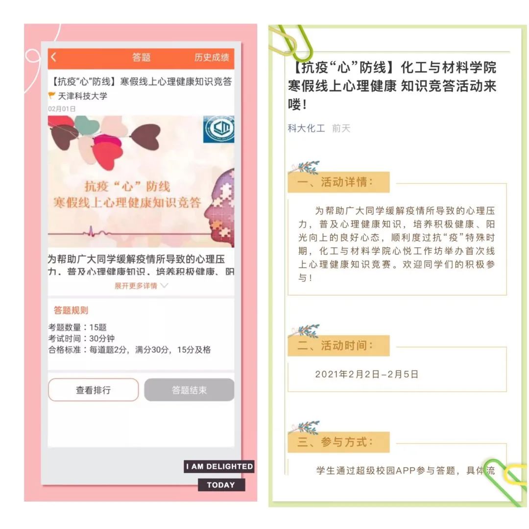 开展抗疫“心”防线线上心理知识竞赛。为帮助学生缓解疫情所导致的心理压力,普及心理健康知识,培养积极健康、阳光向上的良好心态,顺利度过抗“疫”特殊时期,举办了首次线上心理知识竞赛。