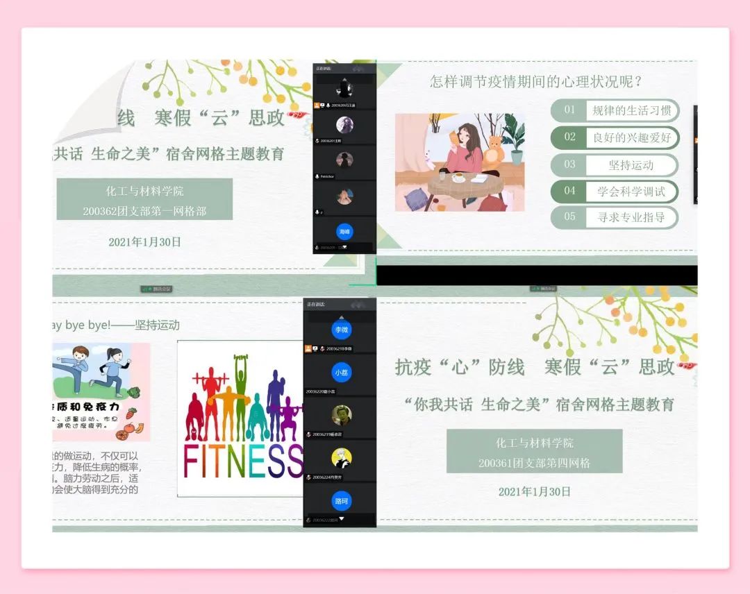 开展“你我共话 生命之美”网格云端思政教育。为拓宽宿舍育人功能,学院以宿舍网格为单位,成立学习交流小组,变“宿舍网格”为思政教育主阵地,“网格员”变身“健康心理宣传员”,主讲“你我共话 生命之美”网格云端思政教育课。学院科学研判学生心理状况,制作“化工学子寒假假期心理健康调试指南”,依托“心悦工作坊”,统一制作心理健康教育PPT,由各网格员主讲,通过网络云端引导学生感受积极的情绪体验,以良好的心态、乐观的精神,抗“疫”攻坚,利用寒假假期时间调整心态,促进学生心智成熟,筑牢“学校—学院—班级—宿舍”四级心理危机防护网。