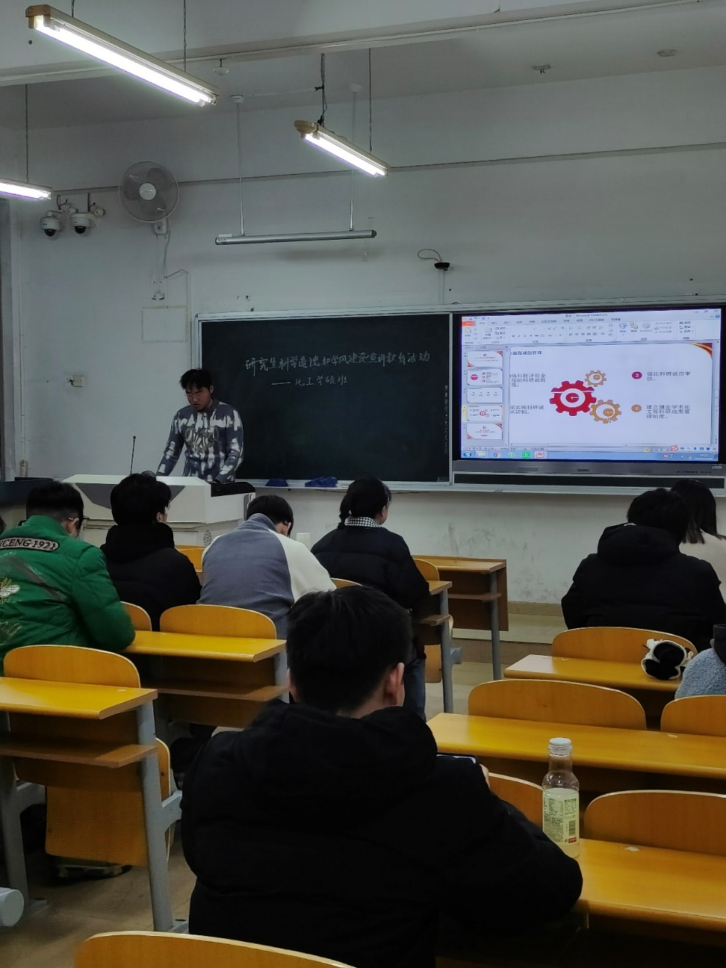 2023级化工专硕3班于11月16日召开主题班会集中学习《关于进一步弘扬科学家精神加强作风和学风建设的意见》。首先,班级宣传委员赵一兰同学对文件中的内容进行逐一分析和阐述,着重讲解了文件中对广大科技工作者做出的要求与建议。随后,班长俞子豪作出总结,并呼吁大家积极响应号召,从自身做起,从当下做起。班级同学做出热情的回应,并表示今后会严于律己,不断规范自身行为。