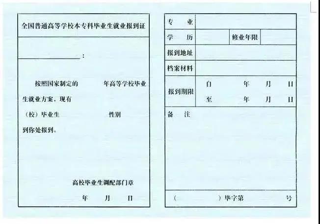 又称“派遣证”,全称是“全国普通高等学校毕业生就业报到证”,由国家教育部直接印制,省级高校毕业生就业管理部门单独签发。报到证一式两联,本科生、高职生上联(报到证)为蓝色,下联(通知书)为白色,研究生上联(报到证)为粉色,下联(通知书)为白色。上联由毕业生本人交至工作单位或存档单位保管;下联统一放入个人档案中保存。
