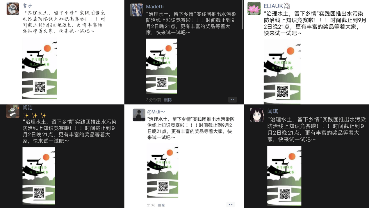 为积极响应“绿水青山就是金山银山”的发展理念,进一步普及水污染防治相关知识,提高我市民众的环保意识,2021年8月29日至9月3日,“治理水土,留下乡情”实践团开展水污染防治线上知识竞赛,旨在通过知识竞赛的形式,巩固水污染防治线上宣讲的成果,寓教于乐,促进广大市民了解和学习水污染防治知识,帮助大家科学对待水污染。