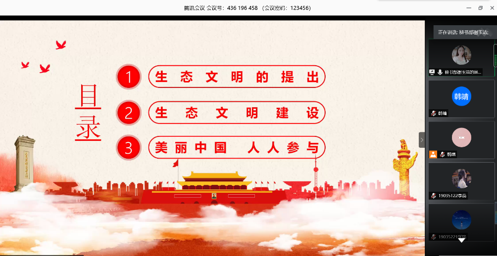 宣讲会伊始,化工与材料学院2019级学生谢玉洁带领各位学生回顾了从农耕时代到生态时代生态文明建设发展的历史和特点,“生态文明是人与人、人与社会、人与自然和谐共生、良性循环、全面发展和持续繁荣的文化伦理形态”。