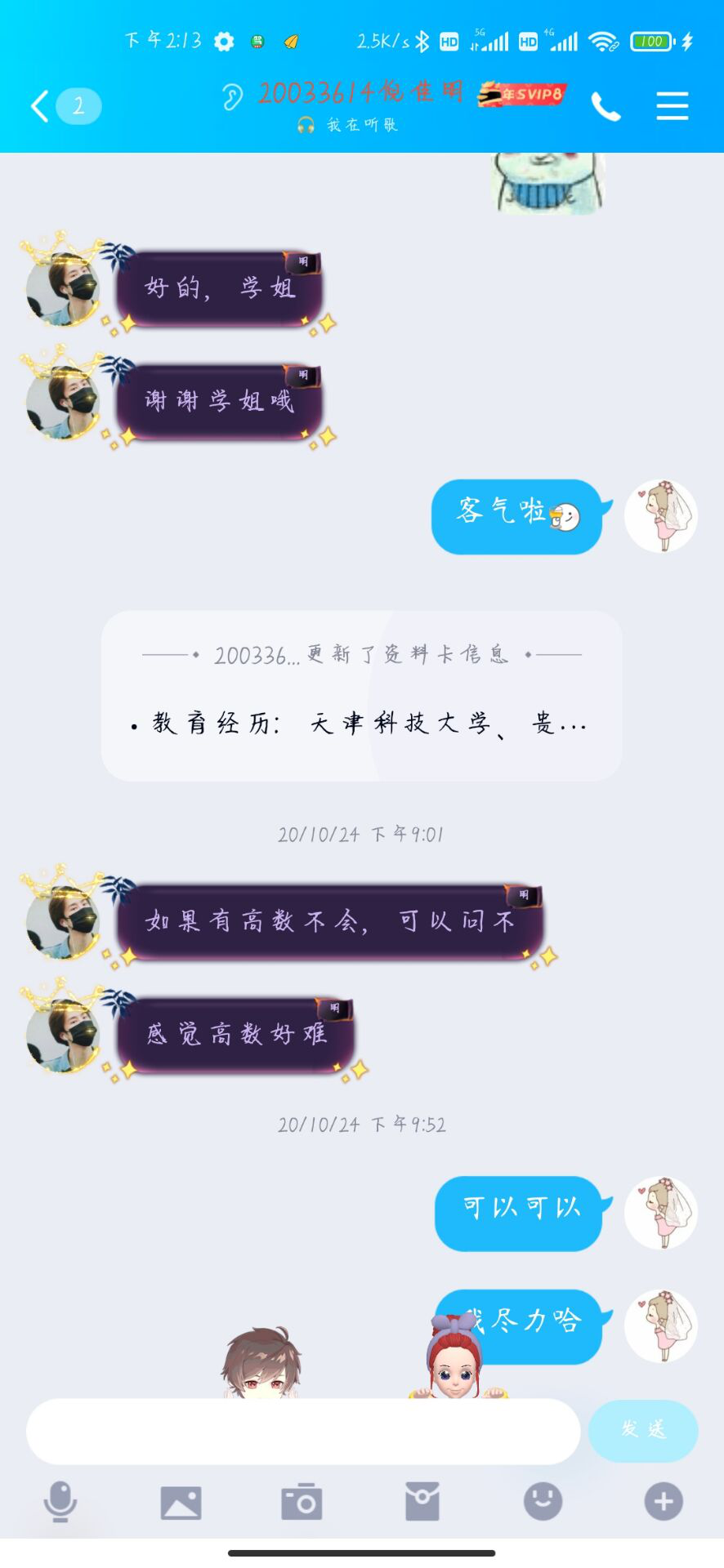 胡洋阳学姐在成为于同学的结对学姐之后,积极与学妹进行沟通交流,“即使专业不同也没有阻碍两人的联系”。得知于同学在备考四级后,胡学姐将自己的四级资料分享于学妹。两人之间不仅仅局限于学姐帮助学妹,更有学姐从学妹努力学习的精神上学习到东西。胡学姐相信两人之间也会将“真诚、善良、和谐”的关怀精神继续传递下去。